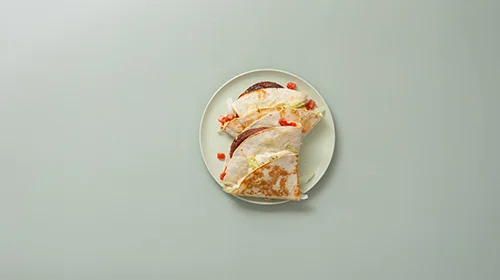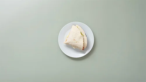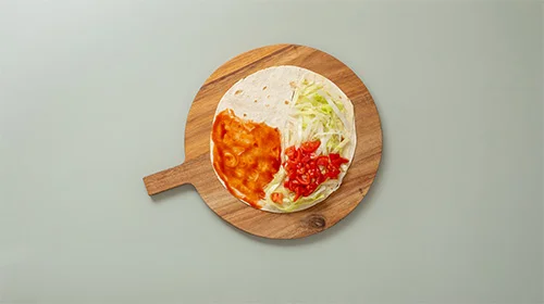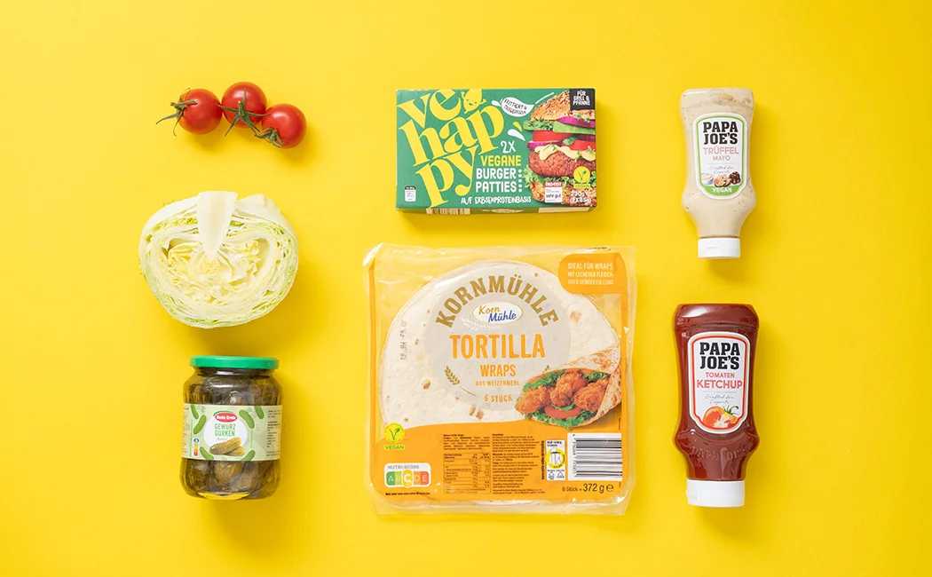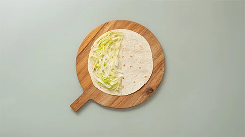 Den Salat auf ein mit Mayonnaise bestrichenes Viertel streuen. Ein weiteres Viertel mit Tomaten und Gurke belegen. Die Patties auf das letzte Viertel legen und, beginnend beim Einschnitt, den Wrap über die Viertel einklappen.