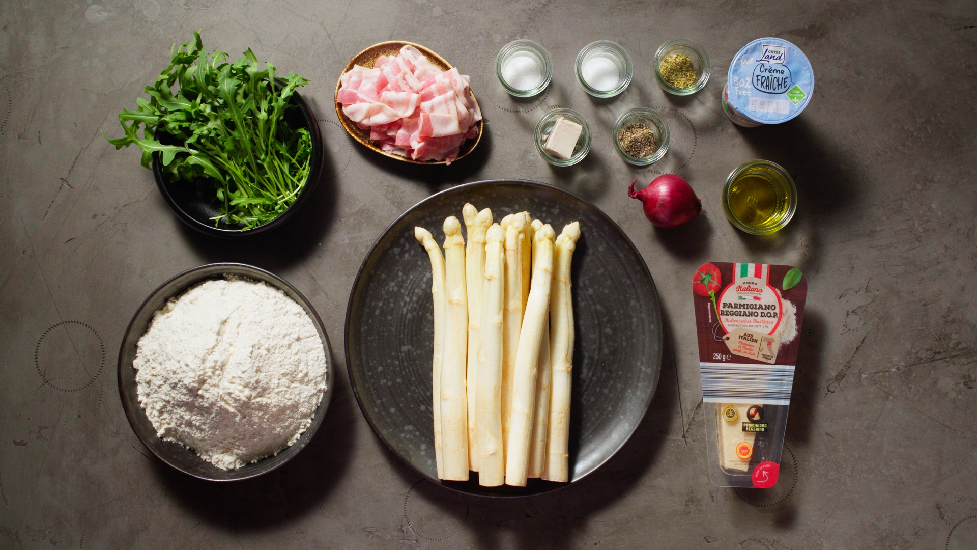 Den Spargel schälen und die Stangen in Salzwasser ca. 10 Minuten kochen. Abschrecken und gut abtropfen lassen. Die Crème fraîche mit Parmesan, Kräutern und etwas Pfeffer verrühren. Die Zwiebel abziehen, halbieren und in feine Streifen schneiden.